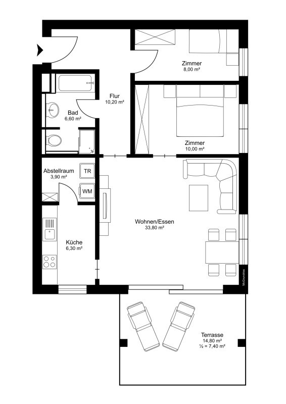 Der großzügige Wohnbereich mit offener Küche bildet das Herzstück der Wohnung. Gartenseitig bodentiefe Fenster sorgen für viel Licht und ermöglichen den direkten Zugang zur Terrasse mit dem angrenzenden, pflegeleicht angelegten Garten – ideal für entspannte Stunden im Freien oder gemütliche Abende mit Freunden.