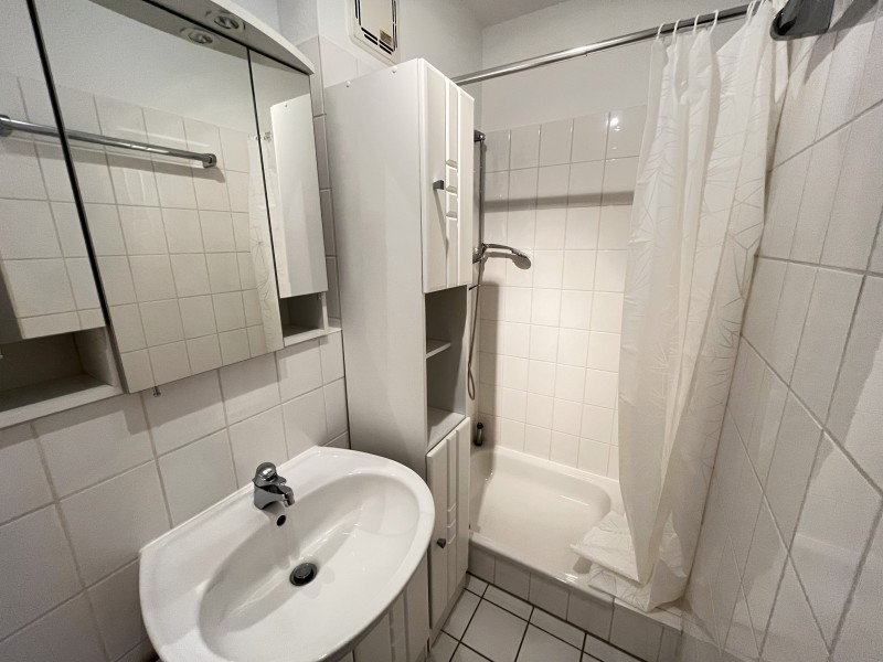 Die Wohnung verfügt über eine Kochnische mit Singleküche und ein weiß gefliestes Duschbad.