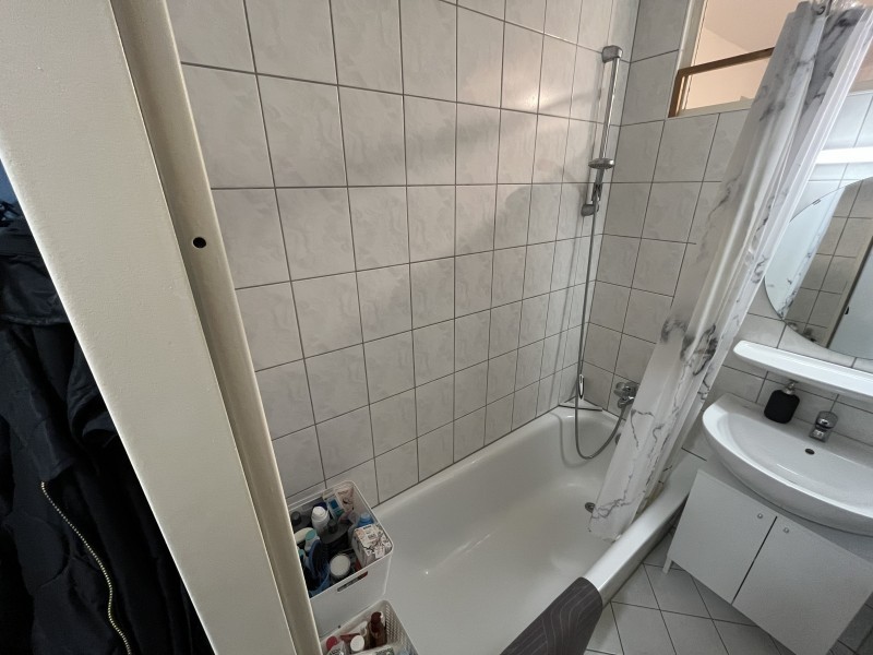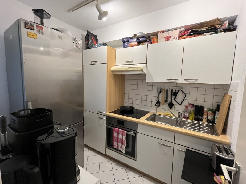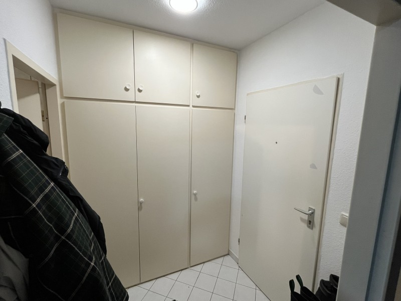 Schöne 1-Zimmer-Wohnung mit Wannenbad, Parkettboden, Küchenzeile und Einbauschrank im Flur. Die Wohnung liegt im Erdgeschoss eines Mehrfamilienhauses und verfügt über einen Balkon.